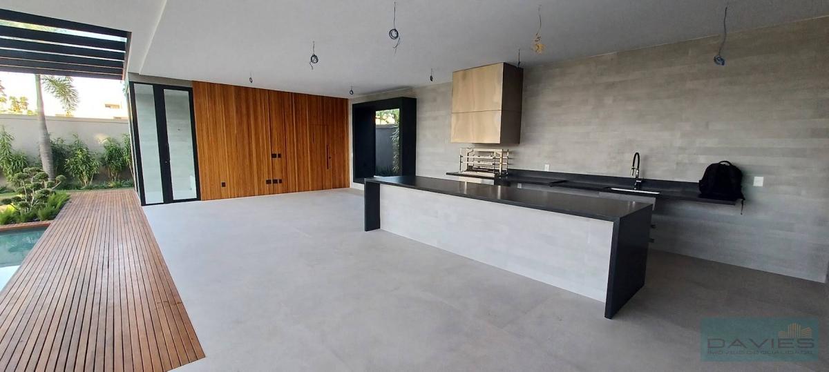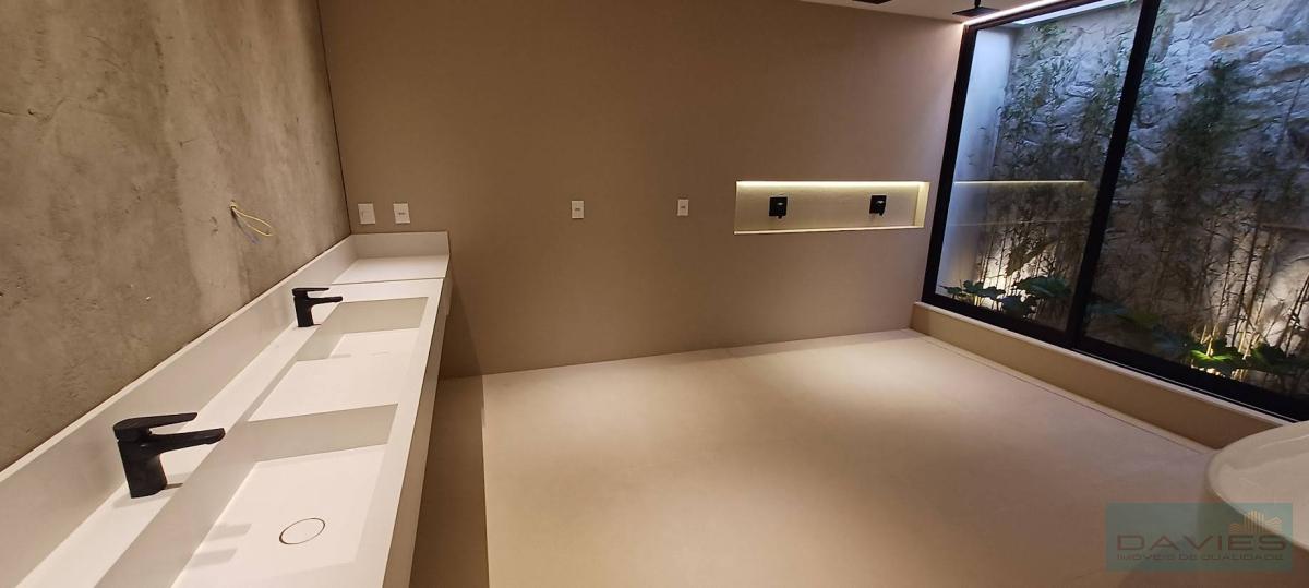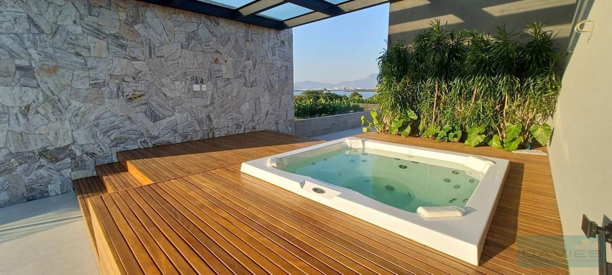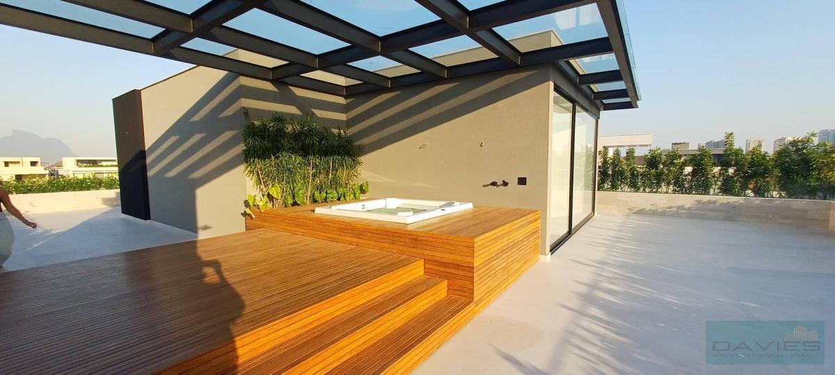 O Alphaville conta com um clube exclusivo composto por: piscinas, spa, salão de festas e de jogos, academia, playground, quadra poliesportiva, quadra de tênis e um maravilhoso bosque com trilha, pista de corrida, vôlei de praia, campo de futebol Society, quadra de tênis saibro, campo de bocha, lagos, áreas para piqueniques, mini golf, pista de skate entre outros. A segurança do Alphaville se destaca entre as melhores da Barra da Tijuca. Sua divisão compreende-se da seguinte forma: 1° Pavimento: Amplo living com 105m², rico em luz natural e ventilação parte dele com um imponente pé direito alto, hall com acesso ao elevador, lavabo, suíte térrea com closet, copa cozinha com ilha, fazendo integração com a área gourmet, despensa e área de serviço com lavanderia e dependência para funcionários. 2° Pavimento: Hall de circulação com elevador, roupeiro e 4 suítes com closet e varanda. O diferencial da master fica por conta do seu tamanho, amplo closet e o salão de banho composto por 2 cubas, banheira de hidromassagem e 2 duchas de teto. 3º Pavimento: Sala multiuso , banheiro social, terraço frontal com SPA e terraço de fundos com. Área de Lazer: Piscina composta por prainha, cascata e hidromassagem acoplada, sauna, varanda aconchegante planejada para receber amigos e familiares com o máximo de conforto, tudo isso aliado a um excelente espaço gourmet com churrasqueira. Banheiro de apoio e lindo paisagismo.